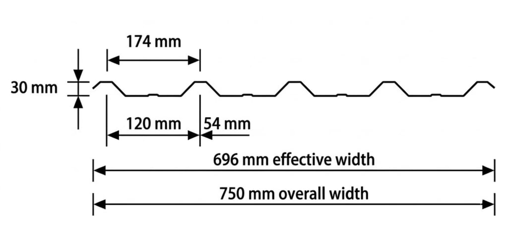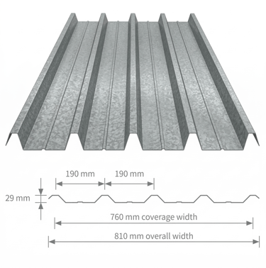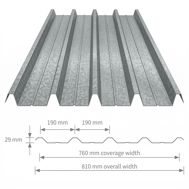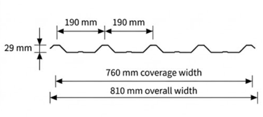High-tensile industrial roofing with 760mm effective coverage. 4-wave design for superior drainage and structural strength.